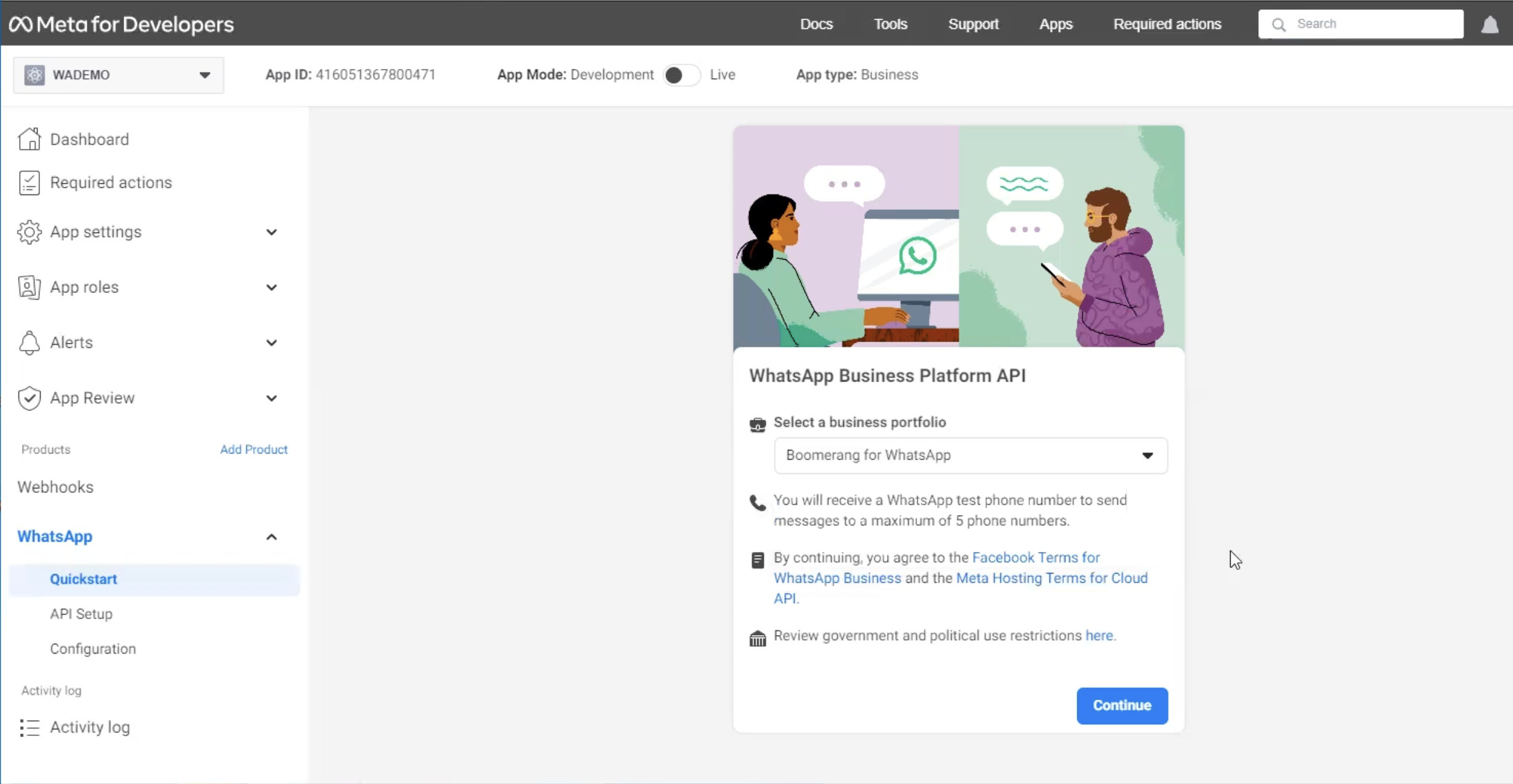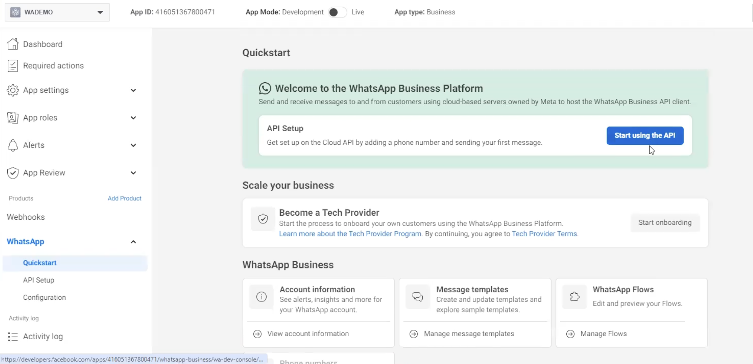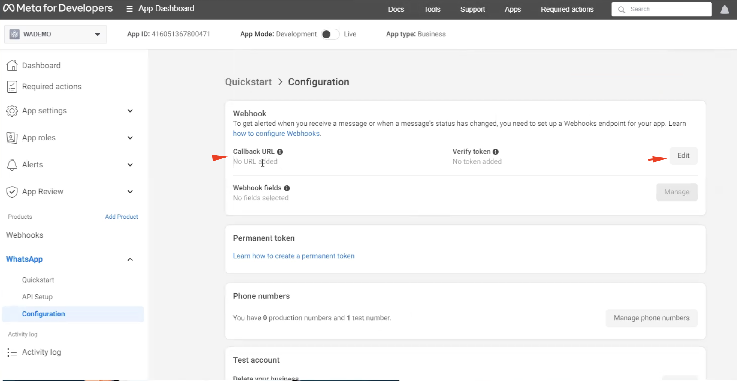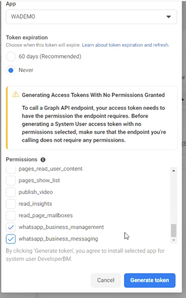 The next step is to configure the permanent token. You can find more information at <https://developers.facebook.com/docs/whatsapp/business-management-api/get-started#1--acquire-an-access-token-using-a-system-user-or-facebook-login>.