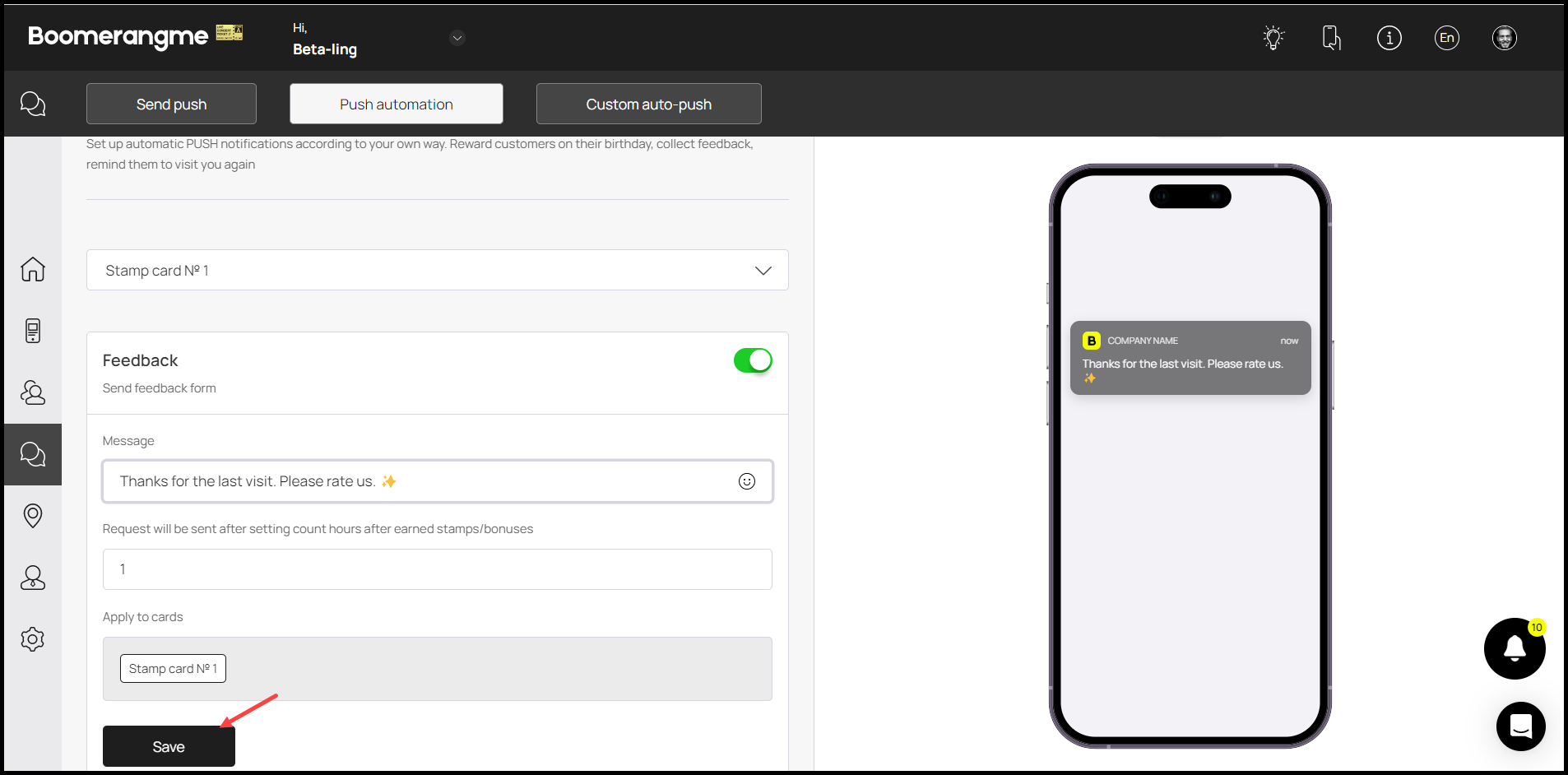 6. Choose the number of hours upon earning stamp after which this message is displayed using the Request will be sent after setting count hours after earned stamps/bonuses field.