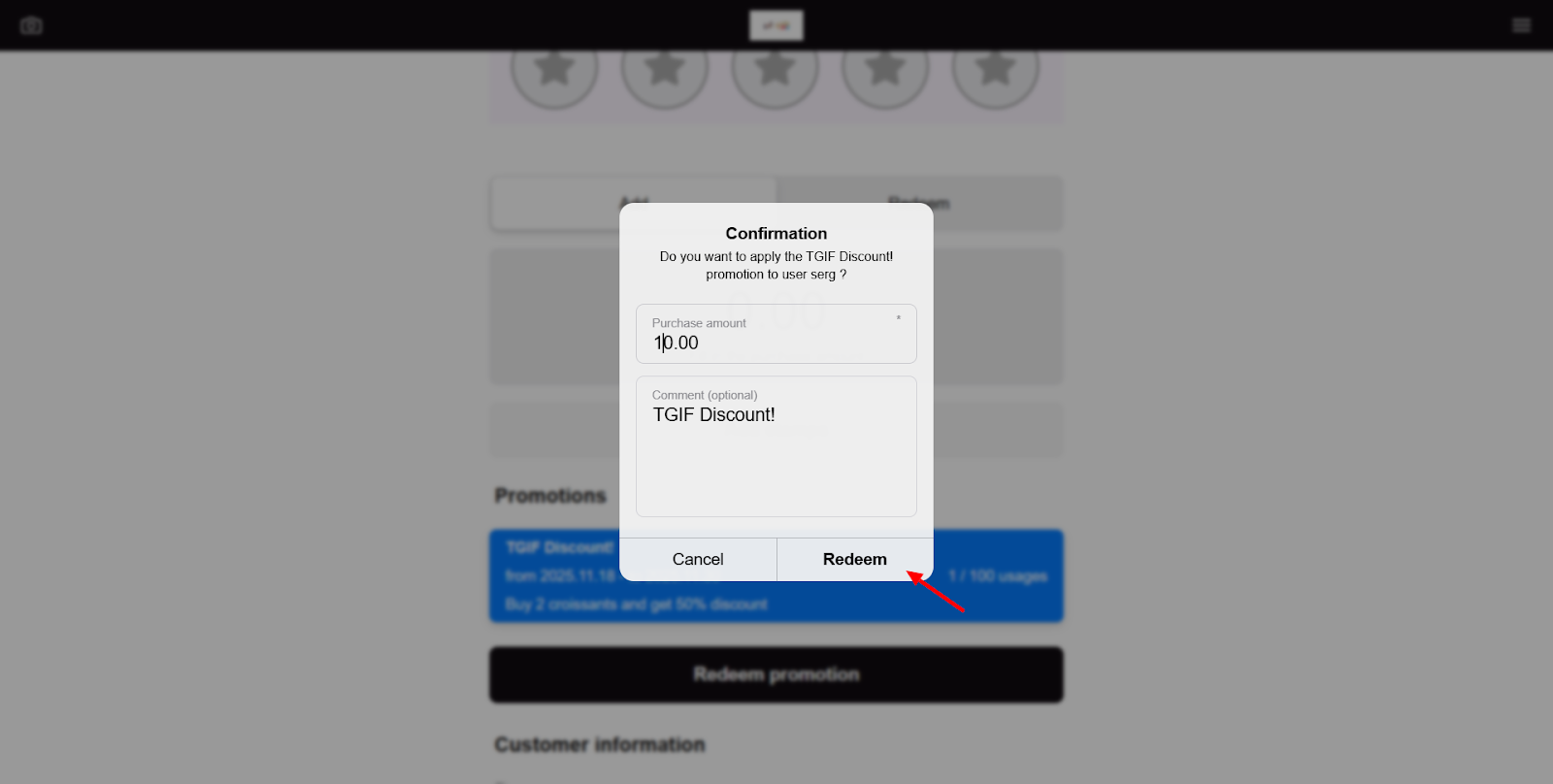 After a redemption is processed, a number appears above the max global usage count (e.g., 1/100). Once it reaches 100, the promotion will no longer be available to clients.